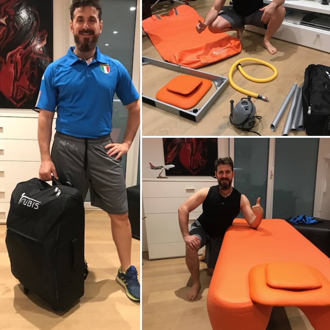 Camilla portátil de gran calidad y fiabilidad y con unas medidas ideales para poder trabajar. Cuando no la usas cabe en una mochila con ruedas, que incluye una bomba para hincharla en menos de 3 minutos.